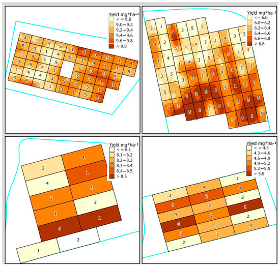 Top, from left to right: Fia19 and Fia20 yield maps used for quantitative analysis; bottom, from left to right: Sod19 and Sod20 yield quantities measured in each experimental unit. The numbers on the plots indicate the different experimental treatments: Flat-N (1); Var-N-Inv (2); Var-N-Dir (3); Var-N-Agrosat (4); and Var-N-Agricolus (5).