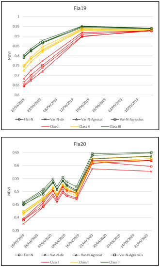 For Fia19, the NDVI time series analysis was performed by classifying plots according to three NDVI classes (NDVI ≤ 0.70; 0.70 < NDVI ≤ 0.77; NDVI > 0.77), as revealed by the S2 image from 22 March 2019 (Table 7, Figure 6). For Fia20, the NDVI time series analysis was performed by classifying plots according to three NDVI classes (NDVI ≤ 0.40; 0.40 < NDVI ≤ 0.44; NDVI > 0.44), as revealed by the S2 image from 19 March 2020 (Table 7, Figure 6). The differences in terms of yield were not significant in either field, while for the Fia20 field, the May 23 NDVI values of Var-N-Agricolus and Var-N-Agrosat were significantly different from Var-N-dir, but not from Flat-N.