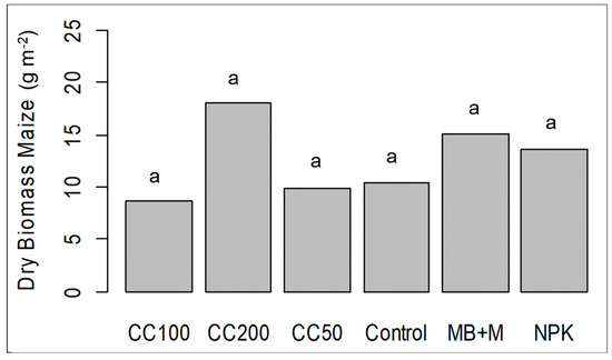 Maize dry biomass in response to maize–mung bean intercropping (MB+M), ComCat® (CC) treatments at rates of 50, 100, and 200 g ha−1 and mineral fertilizer application (NPK) at Matéri, Benin, 28 DAS. Treatments with identical letters above columns did not differ significantly based on Tukey’s HSD test.