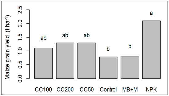 Maize grain yield in response to maize–mung bean intercropping (MB + M), ComCat® (CC) treatments at rates of 50, 100, and 200 g ha−1 and mineral fertilizer application (NPK) at Banikoara, Benin, 84 DAS. Means with identical letters above columns do not differ significantly based on Tukey’s HSD test (p ≤ 0.05).