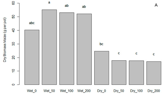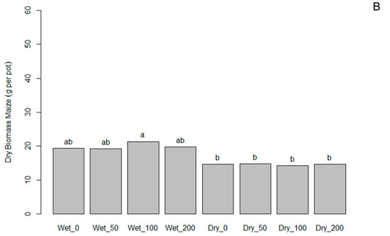 Maize biomass (g pot−1) in response to drought stress and ComCat® application at 50, 100, and 200 g ha−1 at Hohenheim 2020, 47 days after sowing in the experiments (A,B). A rate of 100 g ha−1 corresponds to the recommended field rate. Wet = 80% field capacity, Dry = 40% field capacity. Means with identical letters above the columns do not differ significantly based on Tukey’s HSD test (p ≤ 0.05).