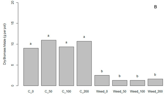 Weed biomass (g pot−1) at Hohenheim 2020 in experiments (A,B), 43 days after sowing and application of ComCat® at 50, 100, and 200 g ha−1 in the experiments (A,B). A rate of 100 g ha−1 corresponds to the recommended field rate. C = weed-free codantrol, Weed = 20 plants per pot transplanted at time of maize emergence. Means with the same letters above the columns do not differ significantly based on Tukey’s HSD test (p ≤ 0.05).