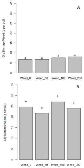 Weed competition and ComCat® treatments did not affect maize dry biomass in experiment 6A (Figure 6). However, weed competition caused an approximately 70% biomass decline in experiment 6B. This might be explained by the higher weed biomass in experiment B (Figure 6). In experiment A, weed dry biomass was recorded at 7–9 g per pot, whereas in experiment B, more than 25 g of weed dry biomass was measured. Evidently, in experiment B, limited resources available for biomass production were exploited by weeds to a greater extent than in experiment A. ComCat® did not affect maize and weed dry biomass (Figure 6 and Figure 7) in both experiments.