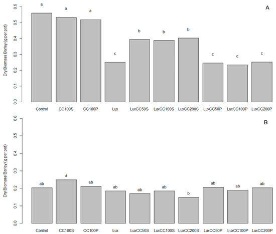Winter barley biomass (g pot−1) in response to post-emergence application of Luximo (Lux) and ComCat (CC) as seed (S) and co-formulated post-emergence (P) applications at 50, 100, and 200 g ha−1 at Hohenheim 2021, 21 and 27 days after sowing in the experiments (A,B). A rate of 100 g ha−1 corresponds to the recommended field rate. Means with identical letters above the columns graph do not differ significantly based on Tukey’s HSD test (p ≤ 0.05).