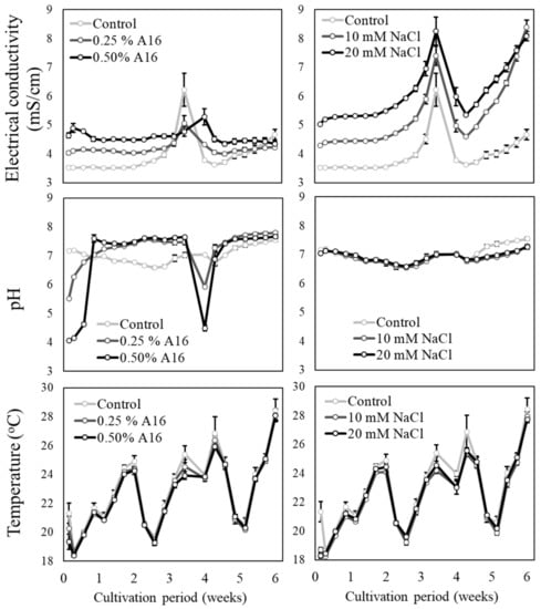 In the present study, the electrical conductivity (EC) of the control NS (without any amino acid or NaCl addition) was 3.5 mS/cm at the beginning of the experiment and was gradually increased up to 6.2 mS/cm before the refill of the tanks with fresh nutrient solutions at the 4th week of cultivation when it dropped back to 3.6 mS/cm and never increased higher than 4.6 mS/cm thereafter (Figure 1).