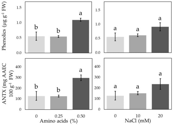 Soluble phenolic content and total antioxidant capacity (ANTX) of peppermint plants grown hydroponically in a floating system on a nutrient solution supplemented either with 0, 0.25, or 0.50% of a commercial amino acid solution (Amino16®) or 0, 10, and 20 mM NaCl. Each column is the mean of three replications with 16 plants per replication. Different letters on the columns in each treatment (amino acids or NaCl solution) indicate significant differences between mean, according to the least significant differences test (LSD) at p < 0.05.