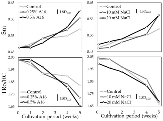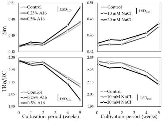The addition of NaCl in the nutrient solution did not affect the operation of photosynthetic apparatus (Figure 4 and Figure 5). At the end of the growing season, the values of the Sm parameter for both species did not differ between salinity treatments and the control, while similar results were observed for energy flow in photosystem II, with no differences in the TRo/RC parameter between three treatments (Figure 4 and Figure 5). According to Havaux [51], under salinity stress, a lower energy flux and efficiency of PSII is established and indeed, in wheat and tomato plants, the gradual increase in salt concentration resulted in decreases of TRo/RC in leaves, which could be attributed to the inactivation of PSII reaction centers and the reduced efficiency of electron transfer in PSII [52].