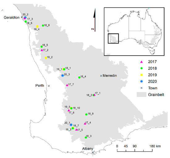 Map showing locations of Sclerotinia stem rot field trials established within the south-western Australian grain belt in 2017 (7 sites), 2018 (10 sites), 2019 (5 sites) and 2020 (3 sites).