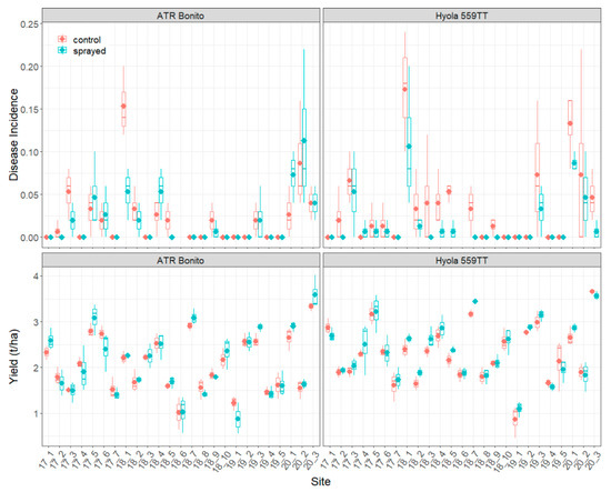SSR disease incidence (proportion of infected plants) and final yield (t/ha) of ATR Bonito and Hyola 559TT canola plants sown at 25 sites across four growing seasons (2017–2020). Two management treatments were applied: no fungicide application (control) and fungicide application at 30% flowering (sprayed).