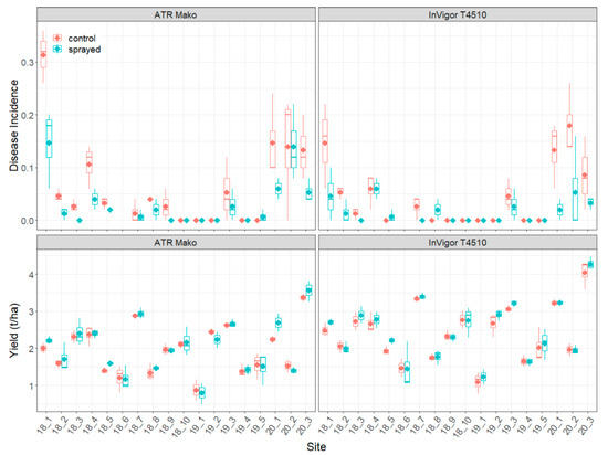 Disease incidence (proportion of infected plants) and final yield (t/ha) of ATR Mako and Invigor T4510 canola plants sown at 18 sites across three growing seasons (2018–2020). Two management treatments were applied: no fungicide application (control) and fungicide application at 30% flowering (sprayed).