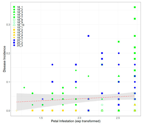 Regression analysis showing S. sclerotiorum ascospore infestation on canola petals (% petals sampled) and SSR disease incidence of canola plants sown at 16 sites across three growing seasons (2018–2020). Petals were sampled from replicate 1 control plots prior to fungicide application at 30% flowering. Petal infestation is shown as transformed exponential data. Red dotted lines indicate regression line, grey shading 95% confidence intervals (R = 0.08, n.s.), site symbols colored according to year.