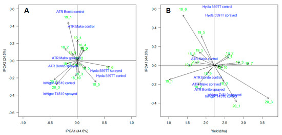AMMI biplots showing (A) IPCA1 vs. IPCA2 and (B) additive effects vs. IPCA1 in four canola varieties (ATR Mako, ATR Bonito, Hyola 559TT and Invigor T4510) from 18 sites across (2018–2020). Two management treatments were applied; no fungicide (control) and fungicide at 30% flowering (sprayed).