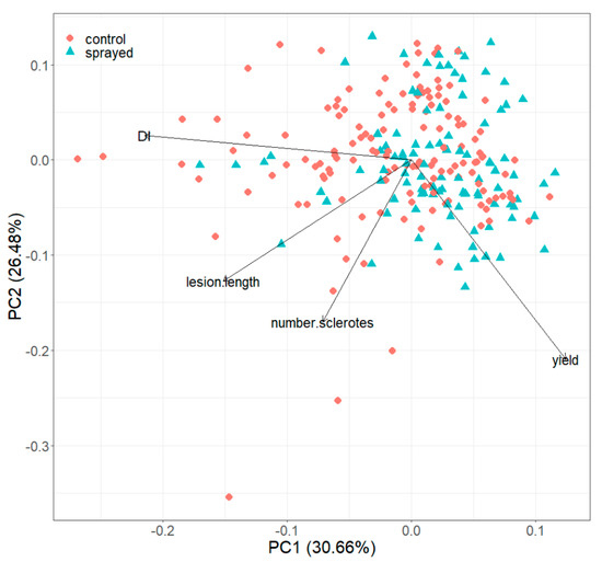 Principal Components Analysis (PCA) biplot of 246 diseased plots from 16 sites across four growing seasons (2017–2020). Two management treatments were applied: no fungicide (control) and fungicide at 30% flowering (sprayed).