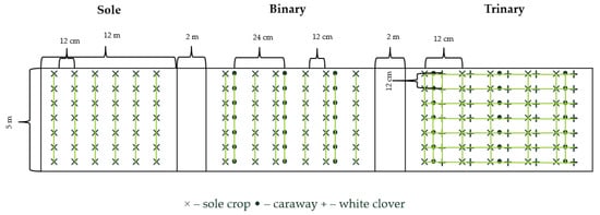 The experimental field was ploughed in autumn 2016, and in spring 2017 it was cultivated with a germinator twice and fertilized with complex fertilizer NPK 8-20-30 (300 kg ha−1). The sown (multi-) crops were: spring barley (Hordeum vulgare L.), spring wheat (Triticum aestivum L.), and pea (Pisum sativum L., caraway (Carum carvi L.) for sole crops; spring barley and caraway, spring wheat and caraway, pea and caraway for binary crops; and spring barley, caraway, and white clover (Trifolium repens L.), spring wheat, caraway, and white clover, and pea, caraway, and white clover for trinary crops (Figure 2). For further information on crop establishment, see Appendix A. We chose to grow caraway in binary and trinary crops because they are biennial plants and the seeds ripen only in the second or the third year. In the first year of vegetation, caraway is sensitive to weed competition.