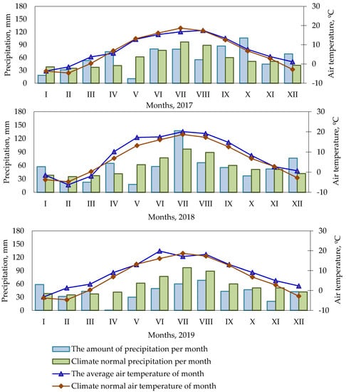In 2017, plant vegetative growth resumed on 31st March. April was cold and humid (Figure 3). May was very dry. The amount of precipitation in June was close to the climate normal. July was cool. In August, HTC was 1.00 (optimal humidity). September was warm. In October, precipitation exceeded the climate normal several times. In January 2018, the temperature was 2.2 °C higher than the multiannual average. February and March were colder than usual. Plant vegetative growth resumed on 4 April. The temperature in April was 3.3 °C higher compared to the multiannual average. The temperature in May was 4.0 °C higher than the climate normal, and the precipitation was 44.1 mm lower than usual.