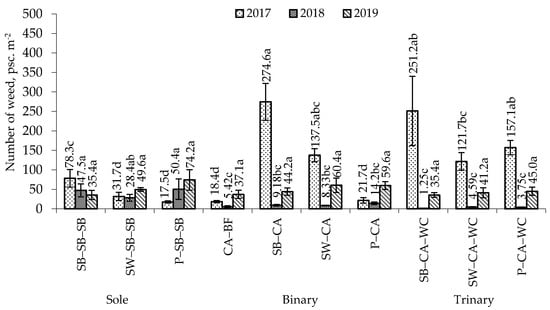 The number of weed in sole, binary, and trinary crops in 2017–2019. Note. CA—caraway, SB—spring barley, SW —spring wheat, P—pea, WC—white clover, BF—black fallow. Differences between the averages of treatments marked with different letters (a, b, c, d) are significant (p < 0.05); error bars indicate the standard error.