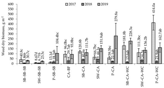 Weed dry biomass in sole, binary, and trinary crops in 2017–2019. Note. CA—caraway, SB—spring barley, SW—spring wheat, P—pea, WC—white clover, BF—black fallow. Differences between the averages of treatments marked with different letters (a, b, c) are significant (p < 0.05); error bars indicate the standard error.