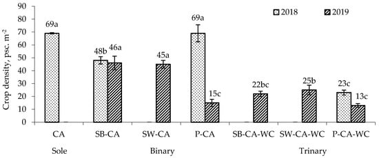Caraway crop density before harvest in 2018–2019. Note. CA—caraway, SB—spring barley, SW—spring wheat, P—pea, WC—white clover. Differences between the averages of treatments marked with different letters (a, b, c) are significant (p < 0.05); error bars indicate the standard error.