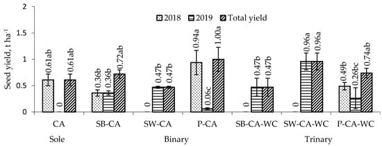Caraway seed productivity, 2018–2019. Note. CA—caraway, SB—spring barley, SW—spring wheat, P—pea, WC—white clover. Differences between the averages of treatments marked with different letters (a, b, c) are significant (p < 0.05); error bars indicate the standard error.