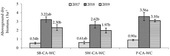 Aboveground dry biomass of white clover in trinary crops in 2017–2019. Note. CA—caraway, SB—spring barley, SW—spring wheat, P—pea, WC—white clover. Differences between the averages of treatments per one experimental year separately (2017–2019) marked with different letters (a, b), are significant (p < 0.05); error bars indicate the standard error.