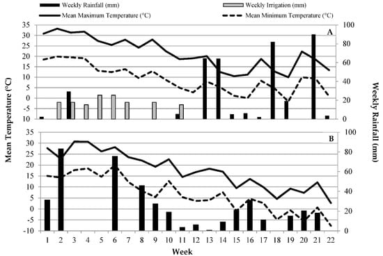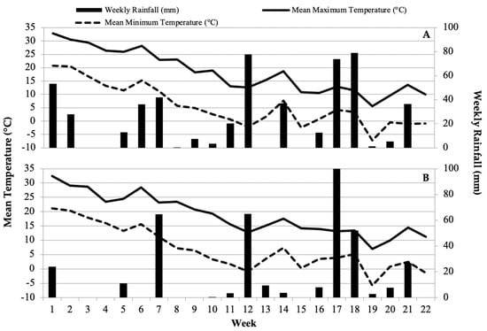 Mean maximum and minimum temperature for the 2016–2017 (A) and 2017–2018 (B) growing seasons of the hybrid brassica trial. Week 1 corresponds to the week of the 1 September planting date and week 22 corresponds to the end of January of each year.