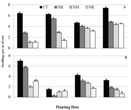 † Means within the same planting date sharing the same letters but are not statistically different according to Fisher’s protected LSD (p < 0.05). Seedlings per m of row of the hybrid turnip 14 days after planting for the 1 September (S1), 15 September (S15), 1 October (O1), and 15 October (O15) planting dates for each land preparation method: conventional tillage (CT), NB, NM, and NR. For the 2016–2017 growing season (A) and the 2017–2018 growing season (B).
