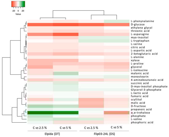 | Chemical Group | Metabolite | Elpida (DT) | Flip03-24L (DS) | ||