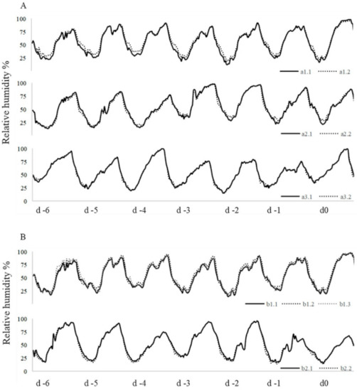 Average daily relative humidity (%) over the last six days before harvest for each variety and treatment. Continuous lines correspond to control cultivars while dotted lines represent treatments. The image shows (A) the use of elicitors) and (B) canopy management systems.