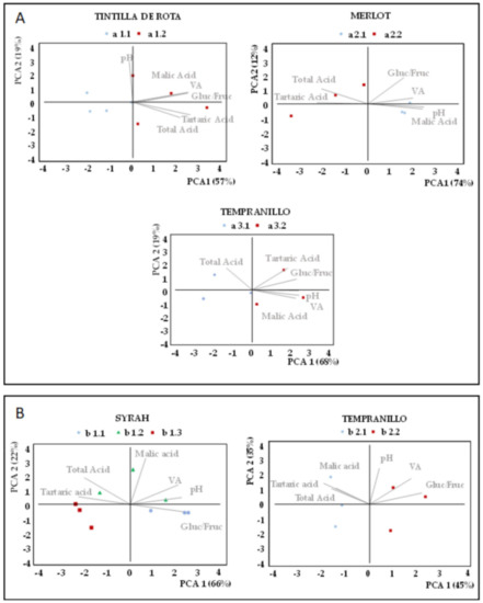 In the case of the canopy management evaluation, test B, it can be seen that for the Syrah variety, the more intense the shoot trimming treatment was, the lower the concentration of reducing sugars produced (Table 2). Statistically, there were no differences between soft and heavy shoot trimming concerning the concentration of reducing sugars in this experiment. These results are the opposite of other studies, where more reducing sugar with heavy canopy management (12.97%) was obtained. Despite this, differences between the control and canopy management cultivars can be observed [27]. Other statistical differences between trimming trials can be seen in the concentrations of malic acid and tartaric acid. The former was more concentrated in grapes of cultivars with soft trimming, while the latter was more accumulated in grapes of cultivars with intense trimming. This effect could be associated with more ripped grapes as malic acid decreases towards the end of the maturation process and the proportion of tartaric acid increases. The PCA done for this cultivar showed two well-differentiated clusters for the control and the intense shoot trimming treatment. The soft shoot trimming cultivar exhibited a transitional behavior, with values falling between the other two (Figure 4B).