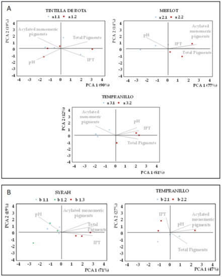 Principal Component Analysis for total and acylated monomeric pigments, total polyphenols index and pH in different varieties of grapes. The image shows (A) the use of elicitors and (B) canopy management systems.