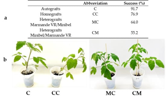 (a) Success percentage for each type of scion/rootstock combination 20 days after grafting (DAG). C (Minibel autografts), CC (Minibel homografts), MC heterografts (Marmande VR scion over Minibel rootstock heterografts), CM heterografts (Minibel scion over Marmande VR rootstock heterografts) (N = 12, 13, 25, and 29 for C, CC, MC, and CM, respectively). (b) Appearance of the representative types of functional grafts 10 DAG.