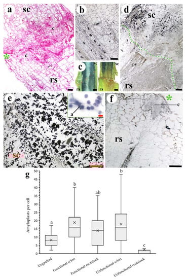 Asymmetrical responses in scions/rootstocks (a) and uneven amyloplast distribution (b–g) in unfunctional grafts. (a) Longitudinal section of 10 DAG unfunctional graft, note the differences in the callus (c) development between scion and rootstock. (b) Longitudinal section of non-grafted tomato stem. See the presence of amyloplasts (dark points) in different tissues of the stem. (c) Free-hand longitudinal section of 10 DAG functional (left side) and unfunctional (right side) grafts observed under a stereoscope. The dark tone indicates amyloplast presence. See the approximately symmetric distribution in the functional graft and the asymmetry in the unfunctional graft. (d) Longitudinal section of 20 DAG unfunctional graft. Note the broken adhesion line (green points) and the asymmetric distribution of amyloplasts between the scion and rootstock. (e,f) Longitudinal section of 10 DAG unfunctional graft scion and rootstock, respectively. See the amyloplast (a) detail in (e). (g) Average number of amyloplasts per cell of sampling image analysis of non-grafted and functional and unfunctional 10 DAG grafts (N = 75 cells). Different letters indicate significant differences at the p-value < 0.05 level after Kruskal–Wallis H-test. (a) Hematoxylin-eosin staining. (b,d–f) Lugol staining. (a,b,d–f) Bright-field images. Asterisk, cut edge; a, amyloplast; c, callus; pv, pre-existing vasculature; rs, rootstock; sc, scion. Scale bars: (a,b,d–f) = 200 µm (10 µm in (e) detail); (c) = 1 mm.