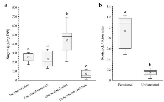 (a) Ethanol soluble sugars content of functional and unfunctional scions and rootstocks. DW, dry weight. (b) Rootstock/scion ethanol soluble sugars ratio in functional and unfunctional grafts. Ratio value = 1 implies same sugar content between rootstock and scion. Different letters indicate significant differences at the p-value < 0.05 level after ANOVA test in (a) and Mann–Whitney U-test in (b). N = 5 and 9 for functional and unfunctional grafts, respectively.