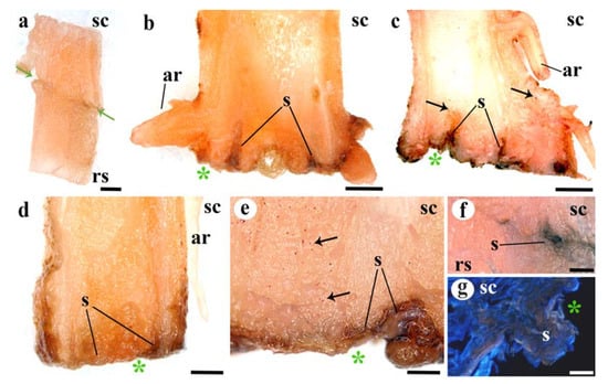 Deposition of suberin in longitudinal graft sections. (a) Functional graft, note the absence of dark brown color at the adhesion line. (b,c) Twenty DAG unfunctional grafts, see the dark tones indicating suberin (s) deposition at the cut edges and cells near the cut. Black arrows indicate lipid inclusions. (d) Ten DAG unfunctional graft, note the suberin (s) deposition at the cut side. (e) Twenty DAG unfunctional graft detail. Note the layer of suberin (s) deposits and the lipid inclusions (red points) indicated by black arrows. (f) Functional graft line of adhesion, see the accumulation of suberin in a small area of non-adhesion. (g) Twenty DAG unfunctional graft detail, see the suberin (s) protuberance, identified by the brow color, at the cut edge. (a–f) Sudan III staining. (g) Calcofluor staining. (a–f) Stereoscope images. (g) Epifluorescence microscope images. Asterisk, cut edge; ar, adventitious root; rs, rootstock; s, suberin; sc, scion. Arrows indicate lipid inclusions. Scale bars: (a–d) = 1 mm; (e,f) = 500 µm; (g) = 200 µm.