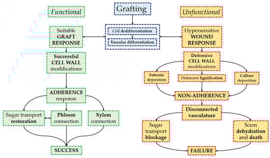 Our results suggest that the mechanism of graft adhesion and/or recognition failed in unfunctional grafts because of a hypersensitive cell wall defense reaction (Figure 7). When it occurs, graft-derived tissue damage would trigger a defense response [51] characterized by suberification, lignification, and callose deposition at the cut edges. It should be kept in mind that these three processes have been previously associated with wound or infection response and oxidative bursts in plants [52,53,54,55,56,57,58].