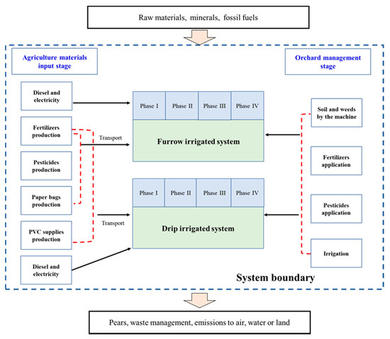 The foreground data were extracted from the orchard managers’ annual production record manuals of the integrated experimental station by the modern agricultural industry technology system during ten consecutive years (2009–2018). The inventory data included the corresponding four phases of pear growth: orchard installation phase (Phase I) for one year, primary growing phase (Phase II) for two years, low production phase (Phase III) for two years, and full production phase (Phase IV) for five years (Table S2). Data about the cultivation and management of pear production were collected. In detail, the fertilization time and ratio, the amount of irrigation water and corresponding electricity usage, the pesticides and paper bags consumption in the fruit growing seasons, the diesel consumed by diesel-guzzling rotavator, and the amount of PVC pipes and buckets used in the drip irrigated system are recorded in Table 1. The additional background data included the transportation of pesticides, paper bags, diesel, and PVC and the waste of leaf litter, paper bags, and pruning branches. Through the investigation in the agricultural supply stores near the orchard, the average transportation distance of agricultural materials above was postulated 50 km. Furthermore, the waste leaf litter was simultaneously operated with the soil tillage by diesel consumed machines in the autumn. The wasted paper bags (assumed as 100% recycling) and pruning branches were transported to the nearby recycle bin (10 km) and power station (20 km), respectively.