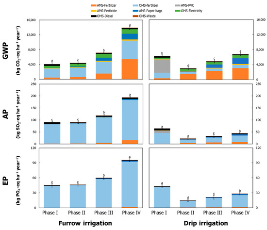 Annual GWP, AP, and EP expressed per hectare of furrow and drip irrigated pear production system in different phases. Phase I–IV represent the orchard installation phase, the primary growing phase, the low production phase, and the full production phase, respectively. AMS and OMS are the abbreviation of the agriculture materials input stage and orchard management stage, respectively. Different letters represent significant differences (p < 0.05) among the phases (a, b, c, and d).