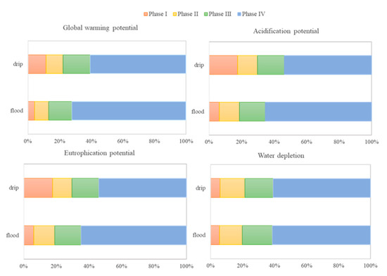 The total amount of the environmental impacts and water depletion during 2009–2018 of the furrow and drip irrigation pear production systems are shown in Table 2. The total GWP, AP, EP, and WD of the furrow system were 96,846 CO2-eq, 1481 SO2-eq, 770 PO4-eq, and 101,901 m3 expressed per ha of pear production, which were 1.7, 3.7, 3.0, and 1.6 times that of the drip system (56424 CO2-eq, 399 SO2-eq, 255 PO4-eq and 63,863 m3). The total GWP, AP, EP, and WD of the furrow system were 225 CO2-eq, 3.3 SO2-eq, 1.8 PO4-eq, and 236 m3 expressed per ton of pear production, which were 1.7, 3.8, 3, and 1.6 times that of the drip system (139 CO2-eq, 0.9 SO2-eq, 0.6 PO4-eq and 148 m3). Phase contribution analysis of the furrow and drip irrigation pear production system is illustrated in Figure 5. The GWP, AP, EP, and WD of the full production phase contributed more than 50% of the total amount during the four phases. In detail, the GWP in phase IV of the furrow system contributed 72.2%, followed by that in phase III (14.6%), phase II (9%), and phase I (4%). The GWP in phase IV of the drip system contributed 60.7%, followed by that in phase III (17.2%), phase I (11.5%), and phase II (10.6%). The AP in the furrow system of phase IV contributed 65.4%, followed by that in phase III (16.0%), phase II (12.4%), and phase I (6.3%). The AP in the drip system of phase IV contributed 53.7%, followed by that in phase III (16.6%), phase I (17.6%), and phase II (12.1%). Similarly, the EP in phase IV of the furrow system contributed 64.7%, followed by that in phase III (16.2%), phase II (12.8%), and phase I (6.3%). The EP in the drip system of phase IV contributed 53.9%, followed by that in phase III (16.6%), phase I (17.8%), and phase II (11.8%). The WD in the drip system of phase IV contributed 61.0%, followed by that in phase III (17.6%), phase II (14.2%), and phase I (5.6%). The WD in the drip system of phase IV contributed 61.4%, followed by that in phase III (18.9%), phase II (14.2%), and phase II (5.6%). The EP in the drip system of phase IV contributed 53.9%, followed by that in phase III (16.6%), phase I (17.8%), and phase II (11.8%). The WD in the drip system of phase IV contributed 61.0%, followed by that in phase III (17.6%), phase II (14.2%), and phase I (5.6%). The WD in the drip system of phase IV contributed 61.4%, followed by that in phase III (18.9%), phase II (14.2%), and phase II (5.6%).