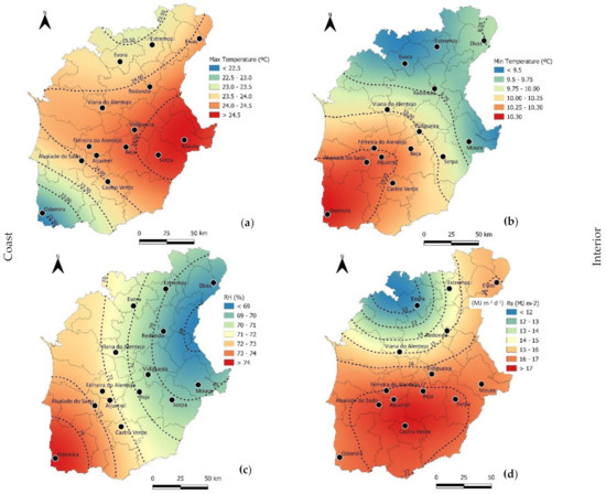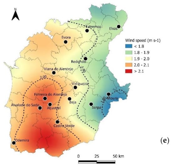 The annual mean and standard deviation for the selected weather variables—maximum and minimum temperature, solar radiation, relative humidity and wind speed—are shown in Table 2. These data were interpolated between stations to cover all Alentejo region, as illustrated in Figure 2, using kriging algorithm. Due to the specific nature of the atmospheric processes leading to rainfall, we left the evaluation of this variable to a dedicated study. The same weather parameters for the same period of observations were collected from NASA POWER from the nearest grid point of the target location.