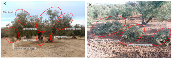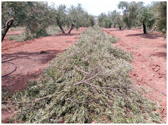 As a source of biomass, olive pruning could provide between 2.5 t ha−1 and 14 t ha−1 of pruning fresh weight in multi-trunk traditional olive orchards [] and traditional big-sized trees [], respectively. Other orchard categories could provide different values of pruning residue for biomass production, oscillating between 1 and 10 t ha−1 for super-high density olive orchards [], while high-density orchards produce 1.2 to 18.5 t ha−1 []. Furthermore, for the olive crop, pruning biomass production is highly variable depending on several agronomical factors such as the cultivar, pruning frequency [], pruning system, soil fertility, or availability of water. Pruning waste could be burned in the field, shredded for use as a mulch to protect soil against erosion or increase soil organic matter content, or even harvested for energetic or other productive purposes. Farmers have stopped burning pruning residue and started shredding it, mainly motivated by narrower tree spacing and the consequent tree damage, but also due to local legal restrictions on burning aimed at preventing wildfires [].