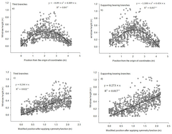 Transversal profile regression functions for the measured windrows using a polynomial function for third branches (a) and supporting bearing branches (b). In addition, windrow shape was transformed into a linear regression to represent triangular-shaped sections for third branches (c) and supporting bearing branches (d). Significance level indicated by ** (p < 0.01). Windrow height was represented by y (vertical axis) and R2 was coefficient of determination.