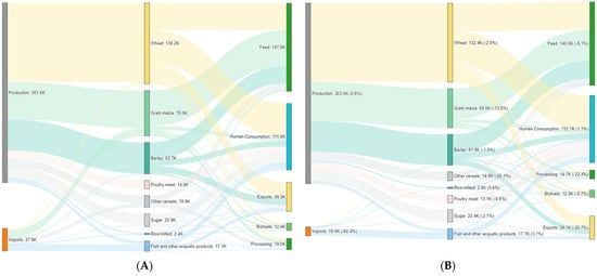 Elements of the market balance for cereals, sugar, and meat markets for the EU, in the baseline and a cease of import scenario, in different tones; (A) presents the baseline; (B) describes the cease of import scenario. The percentage change compared to the baseline is presented in brackets in (B), after the totals in K = 1000 tones.