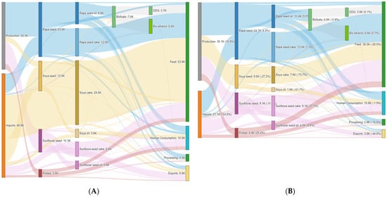 Elements of the market balance for the oil and cake markets for the EU, in the baseline and a cease of import scenario, in different tones; (A) presents the baseline; (B) describes the cease of import scenario. The percentage change compared to the baseline is presented in brackets in (B), after the totals in K = 1000 tones.