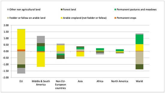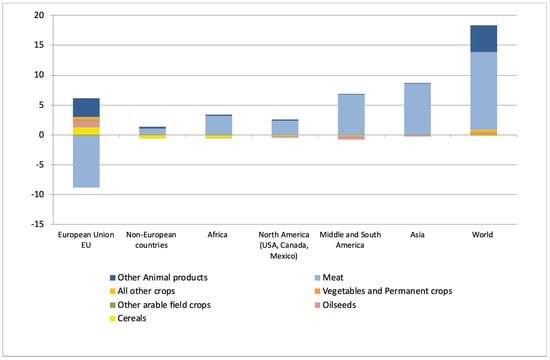 While the production of one ton of soybeans is currently much more carbon-efficient in South America than in the EU, the scenario results in decreasing production in the former and increasing production in the latter. The opposite is true for livestock and other animal products: [] list the carbon emissions in the production of beef, pork, and dairy to be among the lowest in the EU when compared internationally. Production in sub-Saharan Africa or Brazil is linked to significantly higher emissions. Hence, a substitution of domestic EU production by imports from these regions will increase the overall average emissions per ton of product.