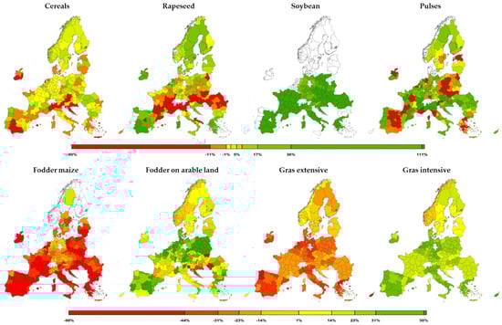 The distribution of land use changes across EU regions is depicted in the maps of Figure 4 for selected crops. The maps show the percentage change for the respective cropping type by NUTS2 region. The production of fodder maize declines due to substitution by protein-rich crops. The decline of extensively managed grassland and the increase of more intensively used grassland is interesting. This affects environmental goods such as the provision of biodiversity in agricultural systems or nutrient emissions. The increase in crop and food prices makes it profitable to produce more intensively, e.g., with a higher use of inputs like fertilizer, or to change from extensive grazing on otherwise fallow land to artificial pastures. The change in intensity can also be observed for cereals, where the yields increase by 2%, for oilseeds (1–3%) and for pulses (7%). An intensification in production can be seen in both the Eastern and the Western parts of the EU. Soy production increases particularly in Romania, Croatia, Hungary, the Slovak Republic, and Italy.