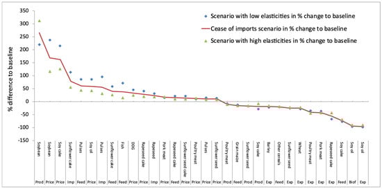 In Figure 1, imports of cereals disappear from the scenario due to the cease of imports. Total market volume decreases for wheat by −3%, for maize by −14%, for other cereals by −25%, and for barley by −2%. Additionally, EU production for the presented crops and animals increases and exports decline to compensate for the decline in imports of maize and other cereals. For all presented products in Figure 1, imports decline by −61%. Production (−2%) and import (−1%) of sugar decline slightly (total market volume −2%), driven by a decline in use as bioethanol feedstock (−2%). Human consumption remains almost unchanged (+1%).