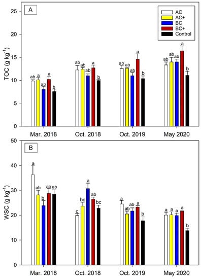 A similar pattern as per TOC could be seen for WSC in soils. The water-soluble C fractions constitute the easily decomposable part of the TOC, being a source of energy for microorganisms []. Our results suggest that different mineralization rates were taking place over the years. At the beginning of the experiment, differences in WSC values with respect to the control were barely noticeable until microorganism adapted to the exogenous input of OM. At the end of the experiment, the difference in available C for all treatments was much more obvious with respect to the control. This behavior was also observed by Madejón et al. [], with similar amendments in degraded soils under fast-growing trees.
