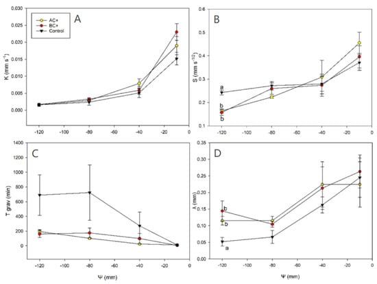 (A) Hydraulic conductivity (K), (B) sorptivity (S), (C) gravimetric time (T grav) and (D) frame-weighted mean pore size (λm) at different potential under different treatments: AC (alperujo compost), AC+ (high dose of alperujo compost), BC (biosolid compost), BC+ (high dose of biosolid compost). The same lowercase letters indicate no significant difference (p > 0.05) between treatments within each year. Data are mean values ± standard error of the mean (SEM).