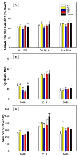 (A) Crown tree size evolution; (B) olive production (kg/ tree); and (C) relation of number of olives per kg during the 3 years of the experiment under different treatments: AC (alperujo compost), AC+ (high dose of alperujo compost), BC (biosolid compost) and BC+ (high dose of biosolid compost). The same lowercase letters indicate no significant difference (p > 0.05) between treatments within each year. Data are mean values ± standard error of the mean (SEM).