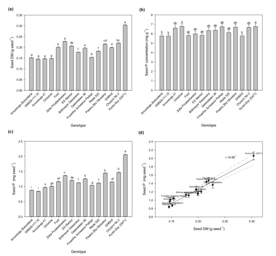 As presented in Figure 1, the tested soybean genotypes differed in seed size, i.e., seed weight (Figure 1a) and seed P content (Figure 1c), and seed P content was closely (linearly) related to seed size (Figure 1d). Seed P concentration was also significantly variable in that set of soybean genotypes (Figure 1b). The seed P concentrations for the varieties in this experiment ranged from 5.76 mg g−1 to 6.79 mg g−1 (Figure 1b). Kyoto-Soy had by far the largest seeds. A group of five genotypes attained only half of its seed weight. The seed P concentrations were much less variable, but here Kyoto-Soy also showed a high value. Consequently, the seed P content was also highest with that genotype. Generally, the seed P content can be explained at 92% by seed weight (Figure 1d).
